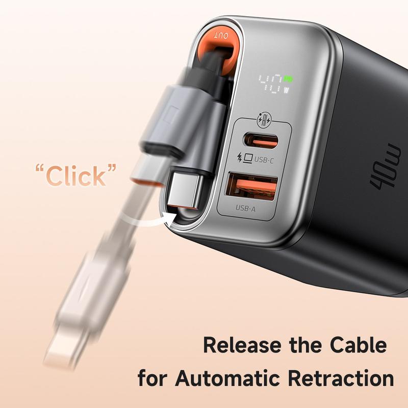 Suffisamment compact pour se glisser dans la poche d'une veste, mais assez puissant pour recharger un MacBook Air ou un Galaxy S24, ce chargeur GaN réunit trois éléments essentiels en un seul : une sortie USB-C haute efficacité de 40W, un port de charge rapide USB-A polyvalent et un câble soigné de 65cm qui s'enroule d'un simple clic.