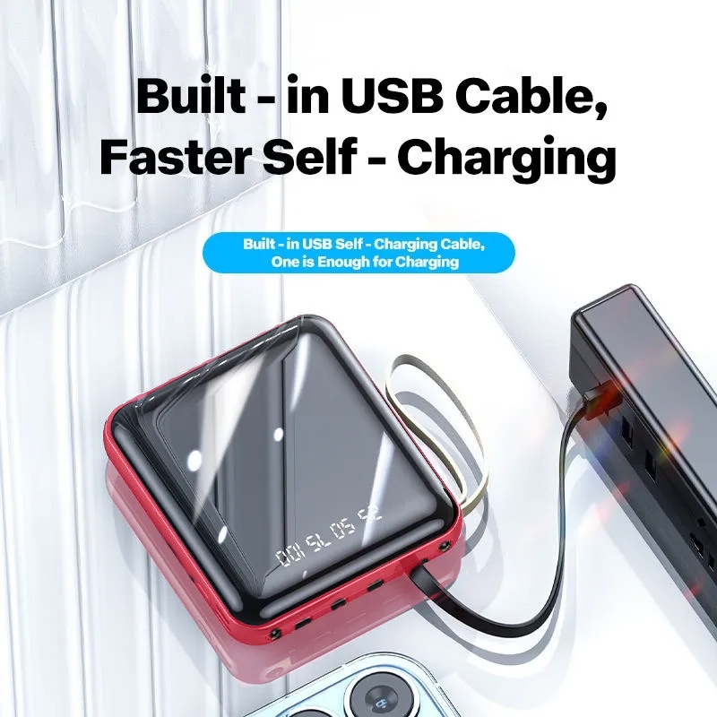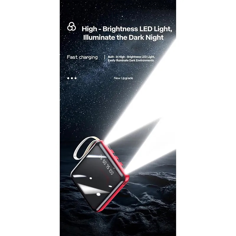 Cette powerbank de poche comprend également trois entrées, des ports microUSB et USB-C et un câble USB intégré. Elle est parfaite pour le camping, grâce à sa capacité de 20000mAh et à ses deux lampes de poche. Une surface semblable à un miroir avec des chiffres LED numériques pour indiquer la puissance restante.