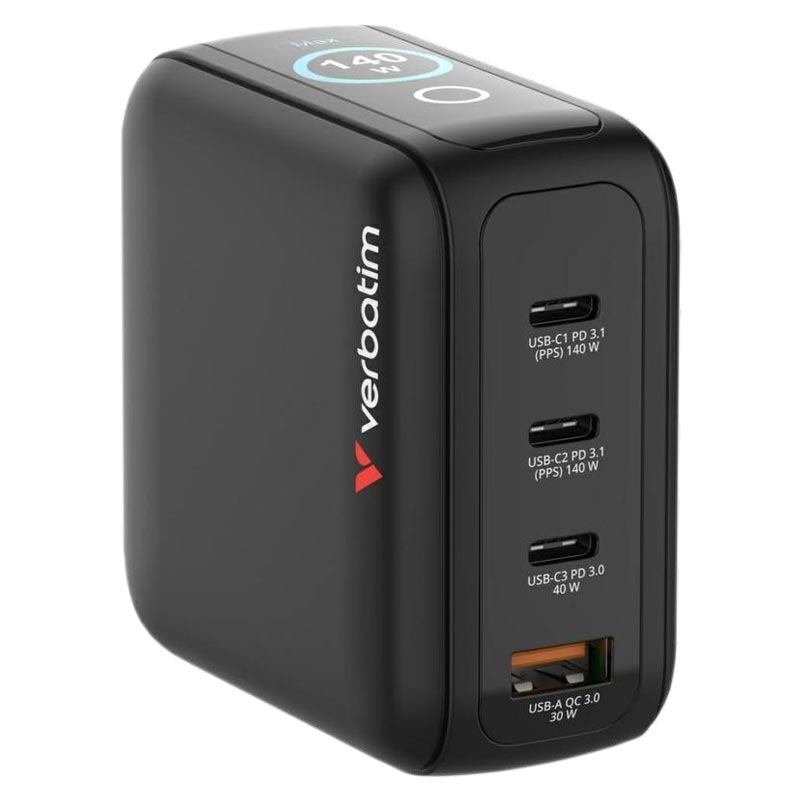 • Mini chargeur mural GaN Verbatim 140W avec écran tactile - 3 ports USB-C + 1 port USB-A - Prises UE/Royaume-Uni/États-Unis