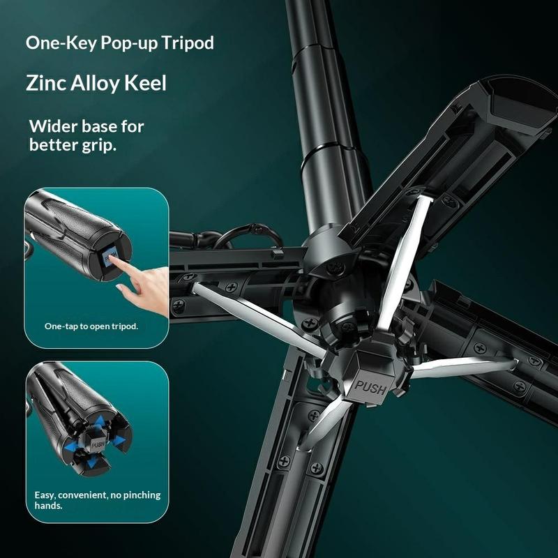 Le trépied à quatre branches avec structure de support en alliage d'aluminium offre une stabilité fiable sur les surfaces planes. Un mécanisme d'ouverture en une seule touche permet une installation rapide, facilitant le passage de l'utilisation à main levée à l'utilisation sur le bureau.