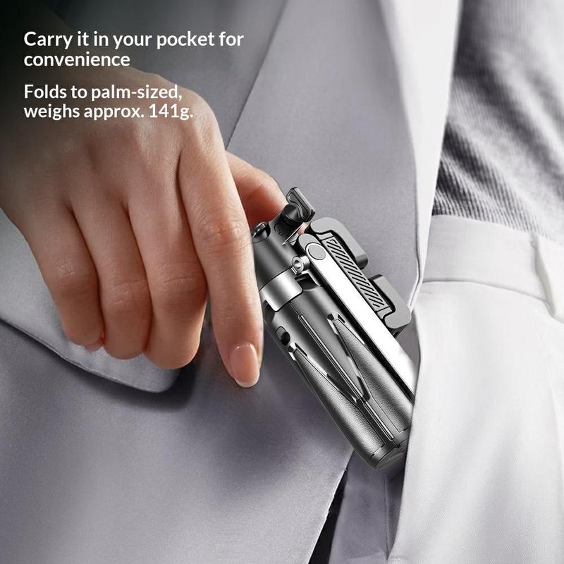 Le modèle pliable s'étend de 11,7 cm à 41,5 cm, ce qui permet de le ranger facilement dans un sac ou un sac à dos. Sa construction légère garantit une utilisation confortable pendant les voyages et les tournages en extérieur.