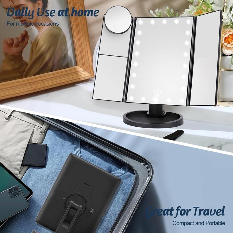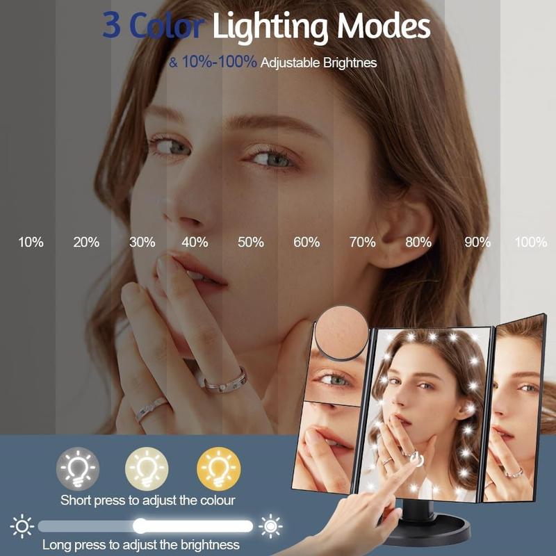 Miroir de maquillage pliable sur 3 côtés avec 22 lumières LED - Miroir de courtoisie grossissant 1X/2X/3X/10X