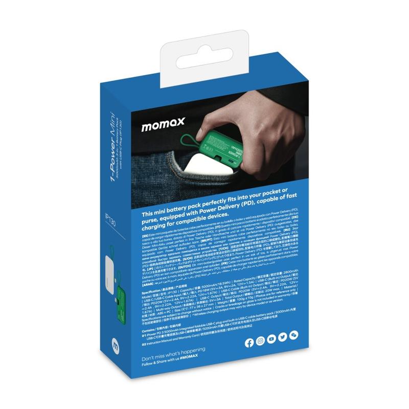 • Momax 1-Power Mini Pop Art 5000mAh Power Bank / Chargeur portable avec prise USB-C, câble USB-C, port USB-C - 20W