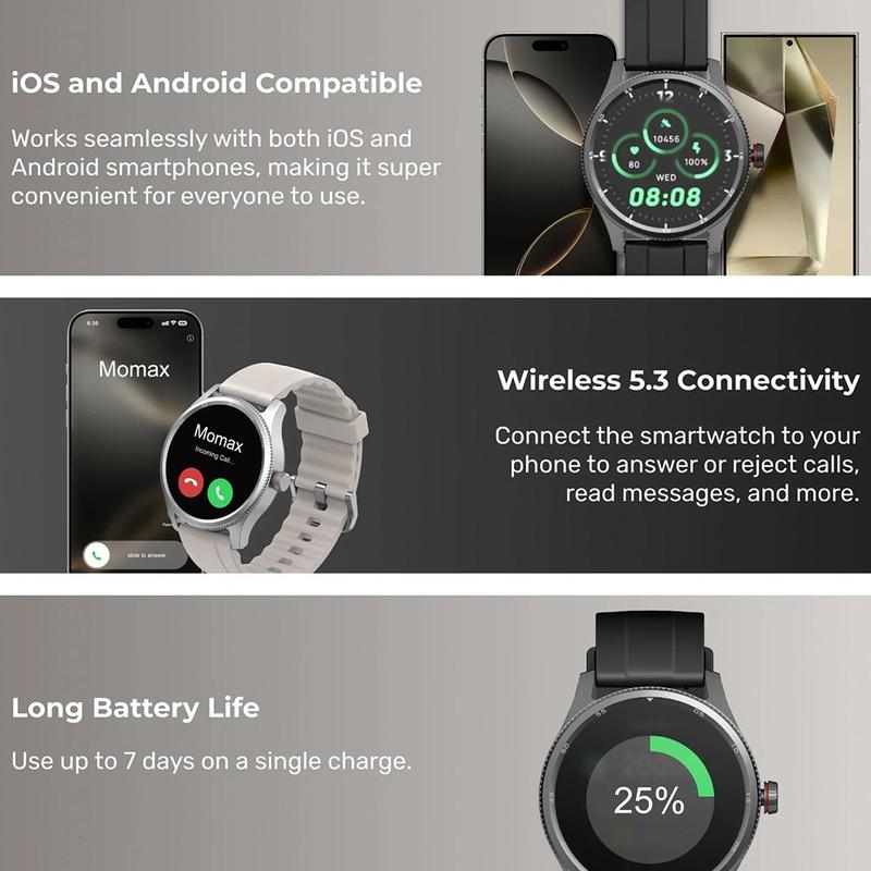 La MOMAX 1-Wear est une montre polyvalente et performante si vous souhaitez bénéficier d'informations sur votre santé, d'un suivi de vos activités et d'une connectivité quotidienne dans une montre confortable et facile à utiliser. Vous bénéficiez d'une expérience riche en fonctionnalités (plus de 100 modes sportifs, analyse du sommeil par IA et protection IP68) sans avoir à la recharger tous les soirs, ce qui en fait un choix pratique pour les utilisateurs soucieux de leur forme physique et pour tous ceux qui souhaitent simplement suivre leur bien-être.