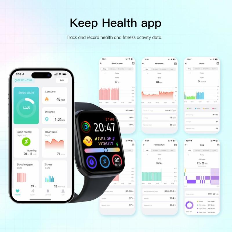 La montre connectée Q23Pro offre un grand écran couleur de 1.83 pouce, des performances fluides et un suivi fiable de la santé et de la forme physique pour une utilisation quotidienne. Conçue avec un boîtier intégré fin et un verre incurvé en 3D, elle prend en charge les appels Bluetooth, le contrôle de la musique et plus de 100 cadrans personnalisables. Avec une longue autonomie, un suivi complet de la santé et une large compatibilité avec Android et iOS, c'est une montre connectée pratique pour rester connecté et actif.
