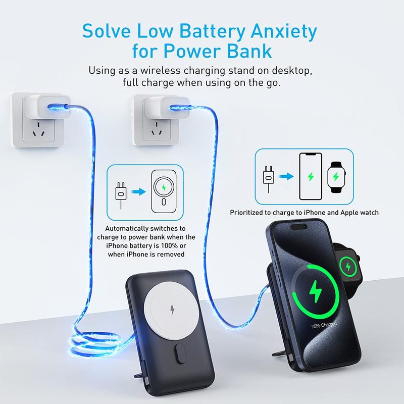 La batterie externe MP07 de 10000mAh est un compagnon de recharge intelligent et polyvalent, conçu pour les utilisateurs qui recherchent plus de commodité, moins d'encombrement de câbles et une plus grande flexibilité au quotidien. Alliant recharge sans fil magnétique, câble intégré, prise en charge de la recharge de l'Apple Watch et support pivotant pliable, elle offre une solution plus élégante pour recharger vos appareils essentiels tout au long de la journée. Que vous soyez en trajet, en voyage, au travail ou simplement en train de vous déplacer d'une pièce à l'autre, ce chargeur compact vous aide à garder votre installation plus propre et plus pratique.