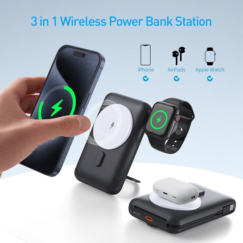 • MP07 - Batterie externe magnétique 3-en-1 de 10000mAh - Compatible MagSafe, chargeur sans fil avec câble intégré et support pivotant pour iPhone, AirPods et Apple Watch