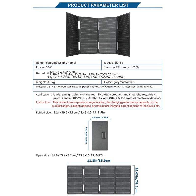 - Chargeur solaire portable de 60W pour une utilisation en extérieur et en cas d'urgence