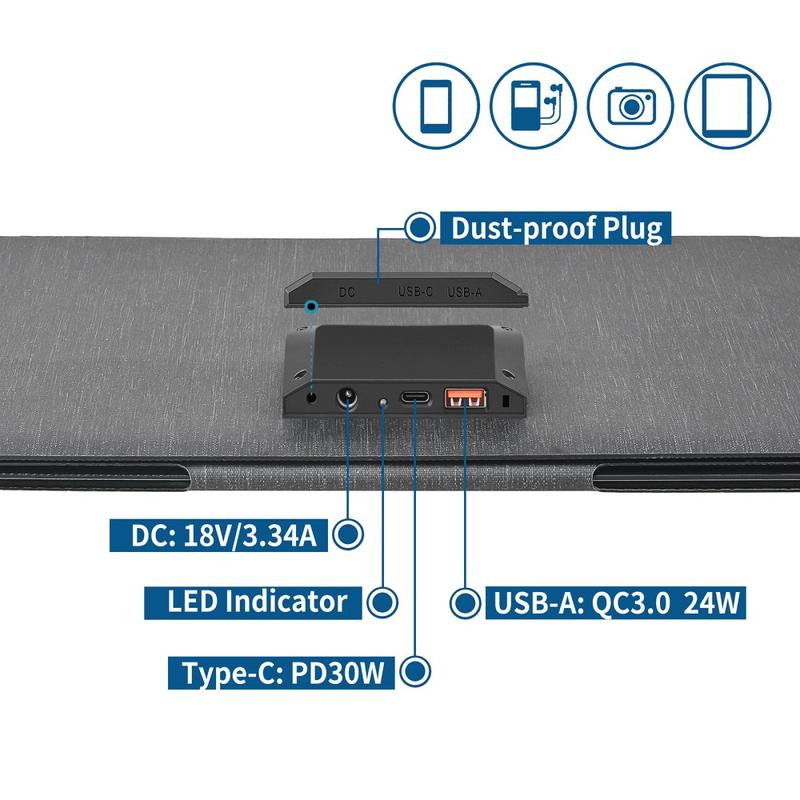 Grâce à son design compact et pliable, ce chargeur solaire est facile à transporter dans un sac à dos, à ranger dans un véhicule ou à fixer à votre équipement de plein air pendant vos déplacements. Malgré sa taille compacte, il offre une puissance de sortie allant jusqu'à 60W et plusieurs options de recharge, notamment en courant continu (DC), USB-A et USB-C, ce qui le rend adapté à la recharge de téléphones, tablettes, batteries externes, petits ordinateurs portables, appareils photo et autres appareils compatibles.