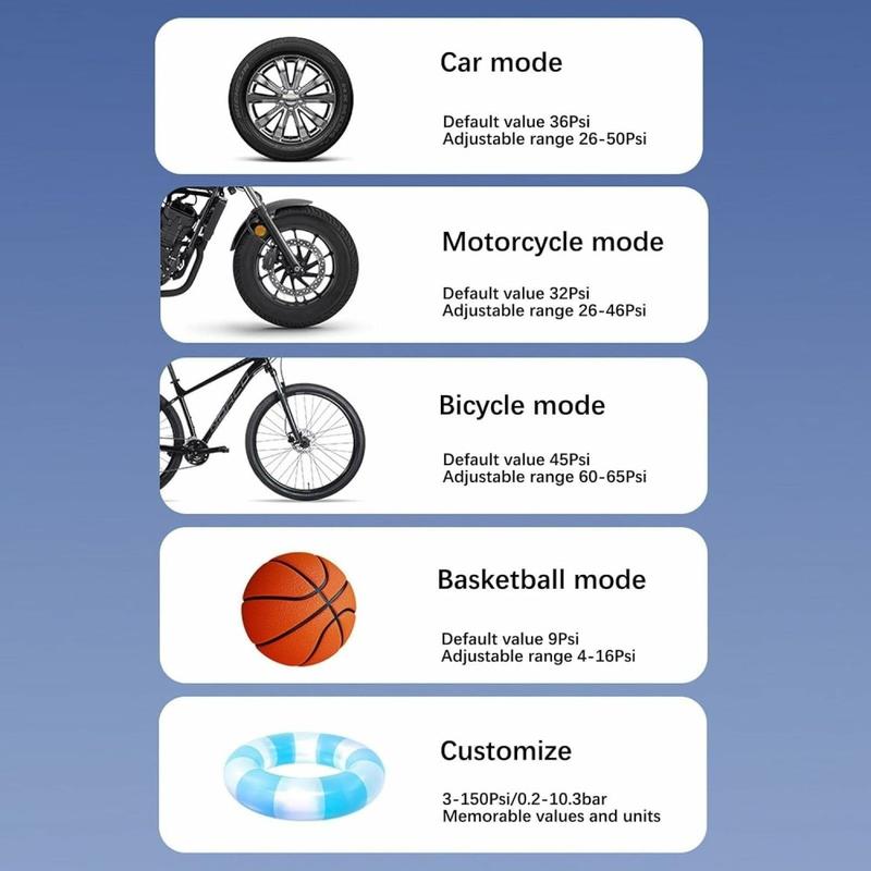 - Modes de préréglage polyvalents : Choisissez entre les modes voiture, moto, vélo ou ballon, ainsi que le mode manuel.