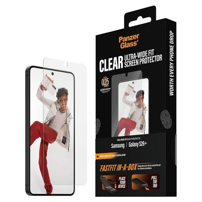 La protection d'écran PanzerGlass Ultra-Wide Fit pour Samsung Galaxy S26+ est conçue pour une installation rapide et sans bulles grâce au système innovant FASTFIT IN-A-BOX. Placez simplement votre Samsung Galaxy S26+ face vers le haut, tirez sur la languette et profitez d'un protecteur parfaitement aligné à chaque fois - pas de poussière, pas de frustration.