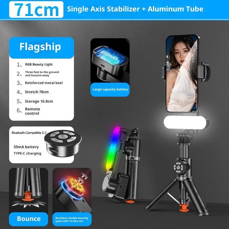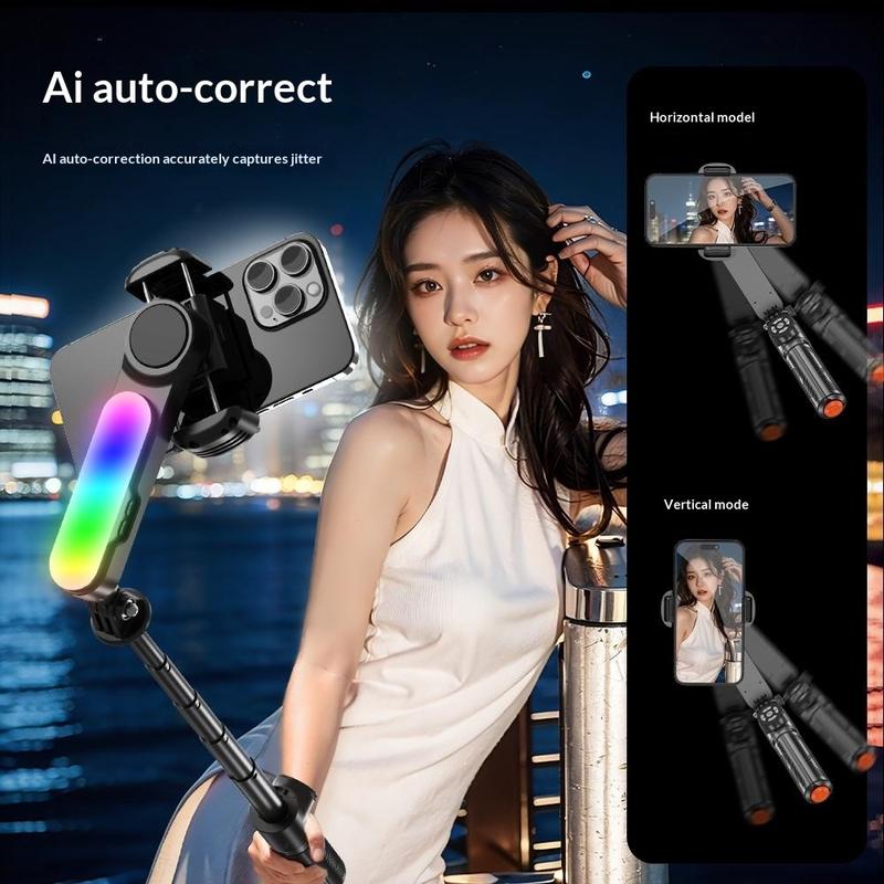 • Stabilisateur à cardan pour selfie Q34 AI Anti-Shake - Support pour téléphone extensible jusqu'à 71 cm avec éclairage de beauté RGB et télécommande