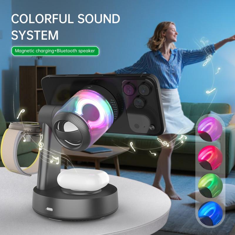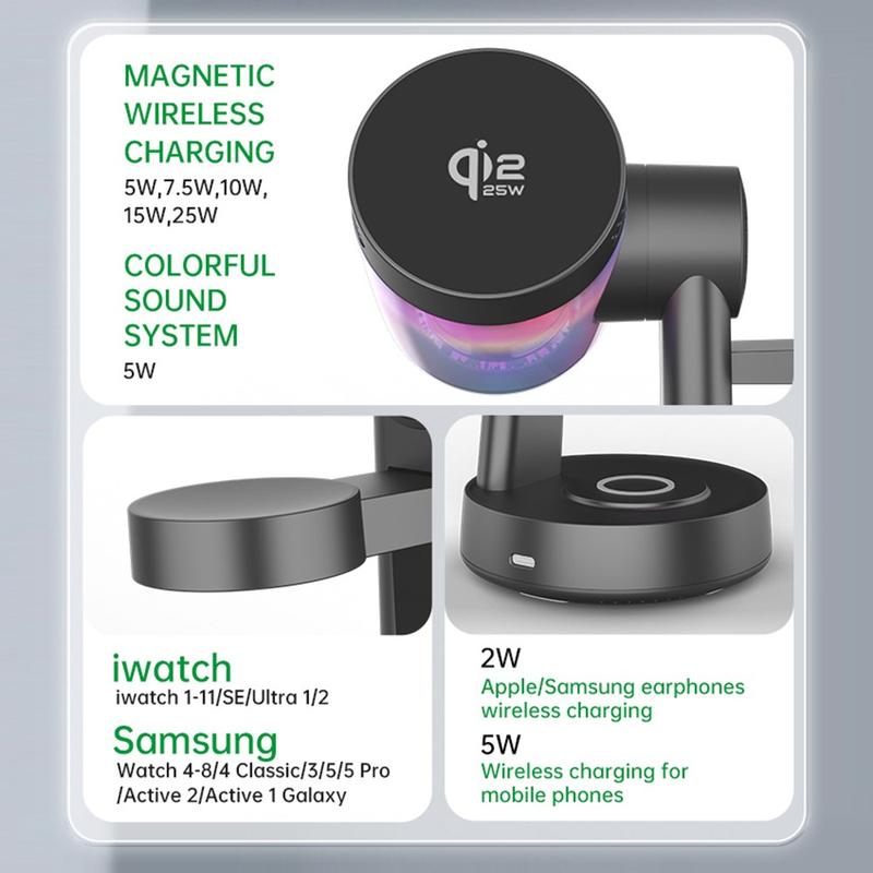 QI2.2 Station de recharge magnétique sans fil de 25W avec haut-parleur Bluetooth et éclairage ambiant RVB - Chargeur 3-en-1 pour téléphone, écouteurs et montre intelligente