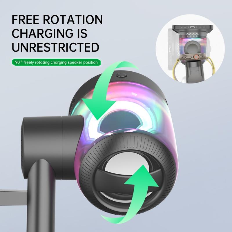 Éliminez l'encombrement des câbles et alimentez tous vos appareils essentiels en un seul endroit grâce à la station de charge magnétique sans fil QI2.2. Conçue pour les bureaux modernes et les tables de chevet, elle combine un chargeur magnétique sans fil de 25W, un haut-parleur Bluetooth et un éclairage d'ambiance RVB, créant ainsi la solution de charge multifonctionnelle ultime pour votre téléphone, vos écouteurs et votre smartwatch.