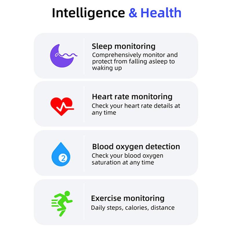 - Suivi complet de la santé via l'application Smart Health - Surveille la fréquence cardiaque, l'oxygène dans le sang, la qualité du sommeil et les niveaux d'activité.