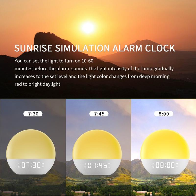 - Lumière de réveil « lever du soleil » qui augmente progressivement la luminosité pour un réveil en douceur