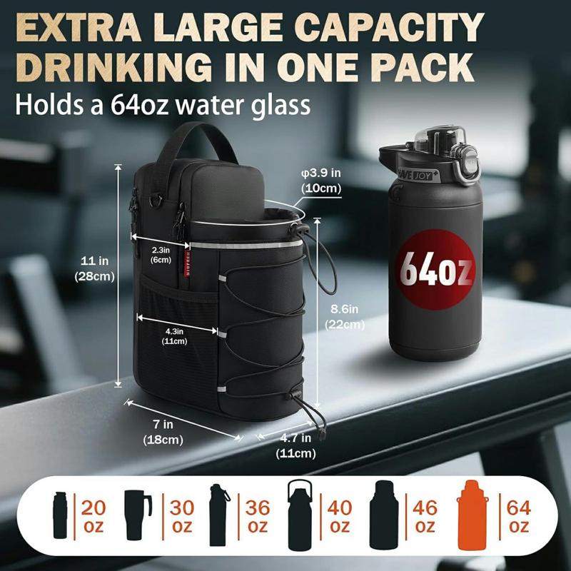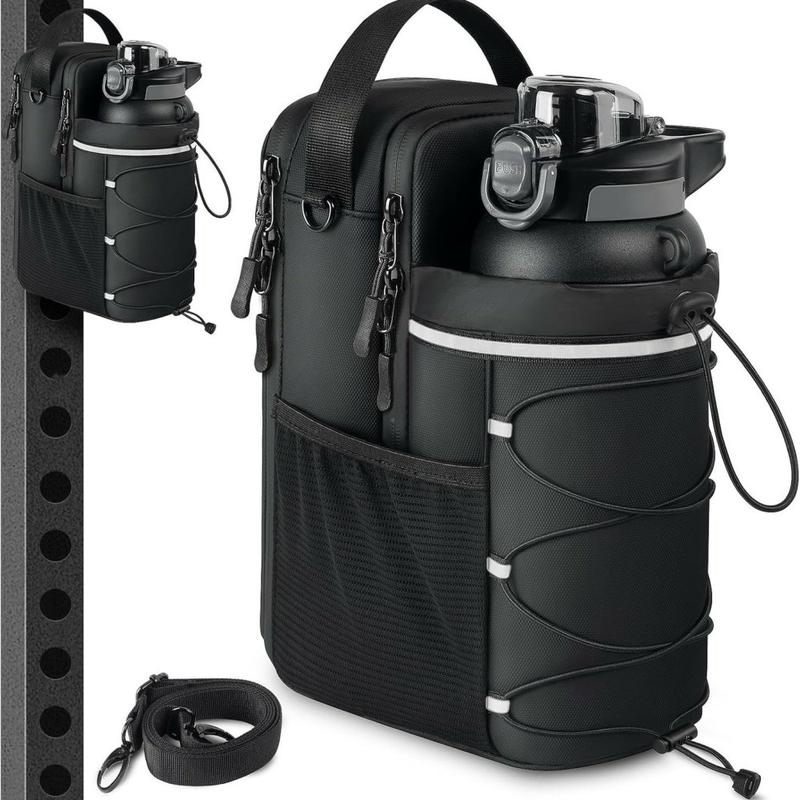 L'hydratation mains libres rencontre un style urbain épuré : cette écharpe imperméable en PU-polyester est équipée de puissants aimants qui fixent une bouteille de 1,9 L / 3 kg à un équipement de gym métallique - ou à votre réfrigérateur - tandis que des poches zippées permettent de garder téléphone, clés et cartes impeccablement rangés.