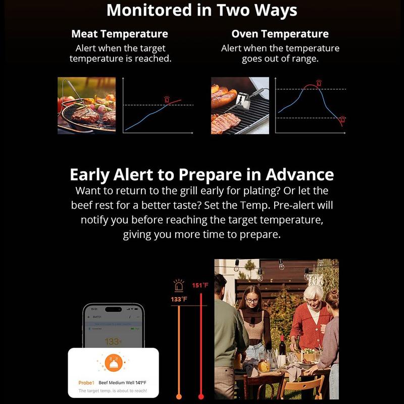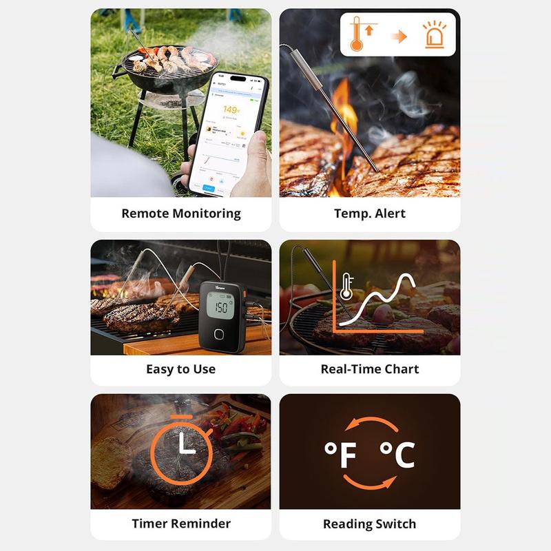 - Cuisine intérieure et extérieure : Surveillez les rôtis, la volaille ou la poitrine sans ouvrir le four ou le gril, en conservant la chaleur et la saveur.