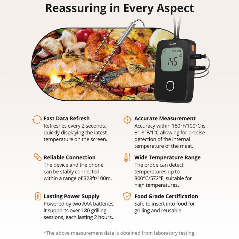 Améliorez votre routine de grillades et de rôtis avec le thermomètre à viande SONOFF BMT01 Bluetooth - où la cuisson précise rencontre la commodité intelligente. Profitez de la tranquillité d'esprit en perfectionnant chaque plat, des steaks juteux aux plats mijotés.