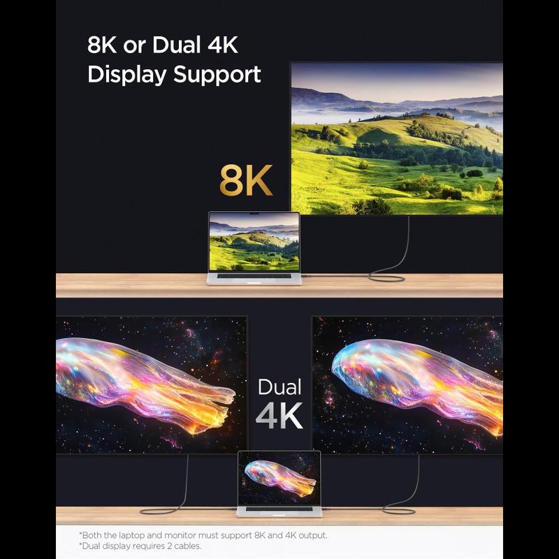 Grâce à sa compatibilité avec Thunderbolt 3 et 4, le câble prend également en charge la sortie vidéo avancée - 8K (un seul écran) et 4K (deux écrans) via DisplayPort 2.0. Il est donc parfait pour connecter des ordinateurs portables ou des stations d'accueil à des moniteurs haute résolution.