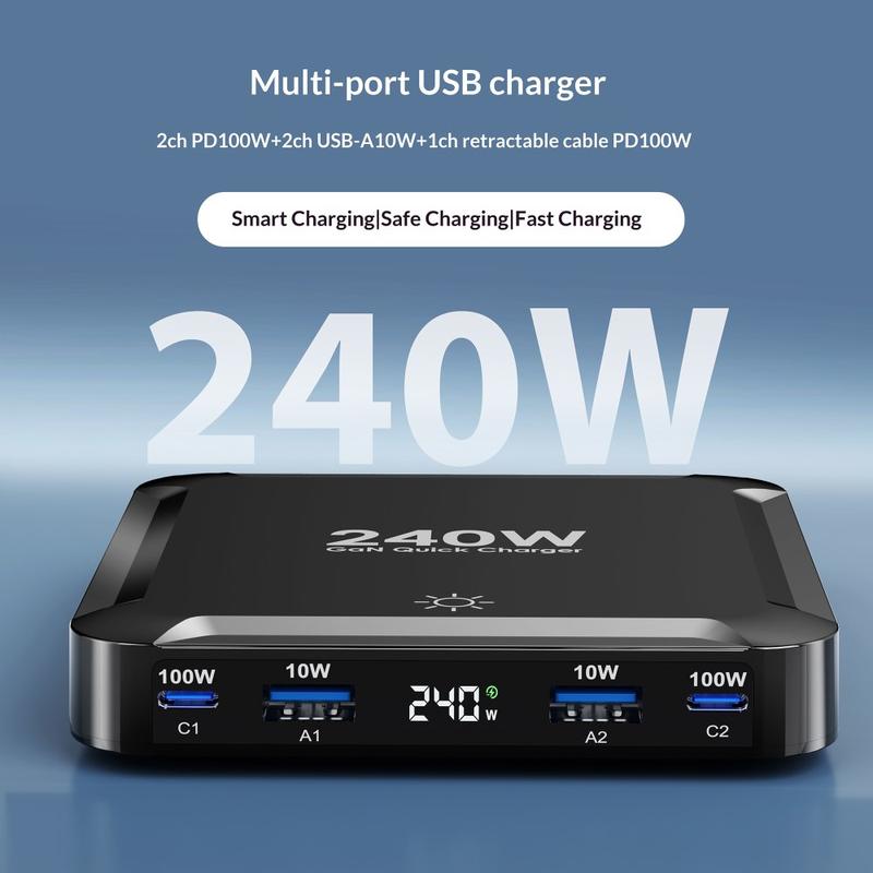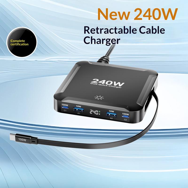 Station de recharge de bureau BK-124D 240W avec câble USB-C rétractable - Hub de recharge rapide avec 2 ports USB-C et 2 ports USB-A, écran LED et prise européenne