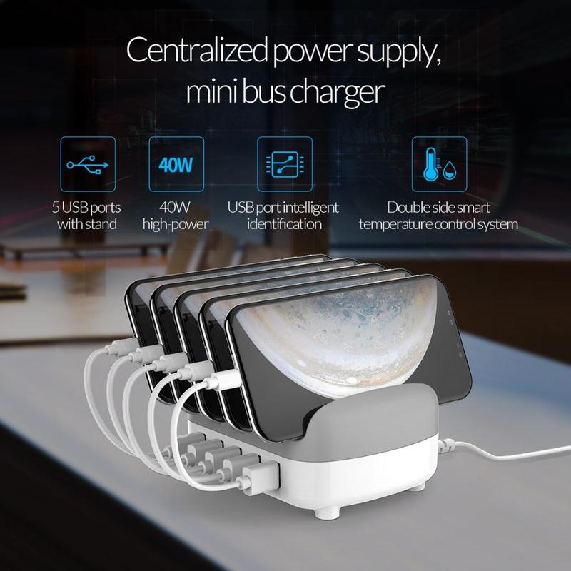 • Station de recharge USB Orico DUK-5P à 5 ports, 40W, avec support pour téléphone et tablette - Prise UE