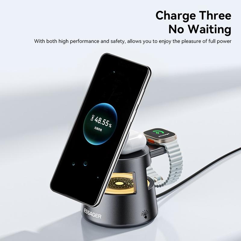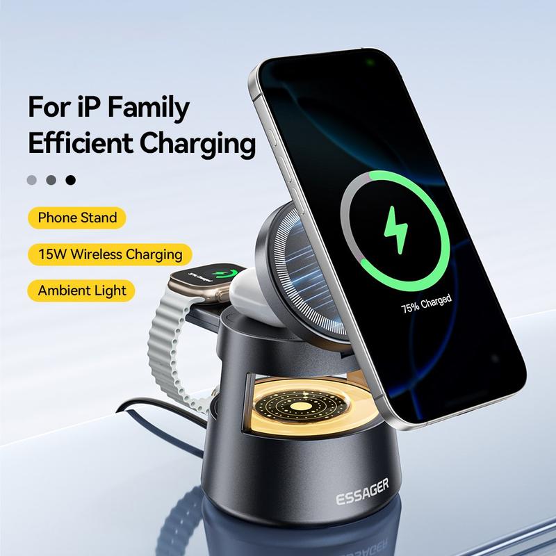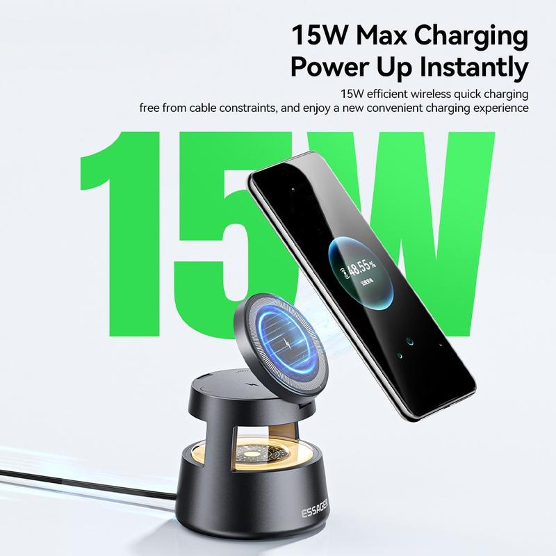 Ce chargeur ESSAGER 4-en-1 combine charge rapide, stabilité magnétique, éclairage doux et prise en charge multi-appareils dans un seul design peu encombrant - parfait pour la maison, le bureau ou le chevet.