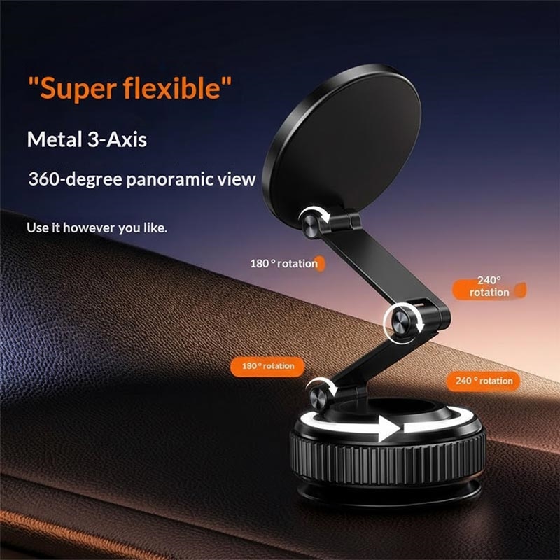 Conçu avec un bras en alliage d'aluminium à trois volets, le support permet un réglage flexible sur plusieurs axes : rotation de la base à 360°, mouvement de l'articulation centrale à 240° et réglage de la plaque supérieure à 180°. Cela permet un positionnement précis pour la navigation, les appels ou le visionnage de médias sous n'importe quel angle.