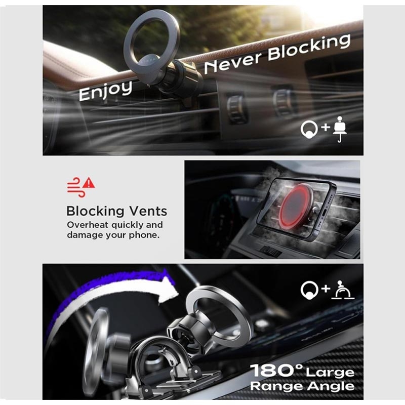 • Support magnétique pour voiture compatible MagSafe Lisen - Fixation sur grille d'aération et tableau de bord, rotule à 360°, adhésif résistant à la chaleur