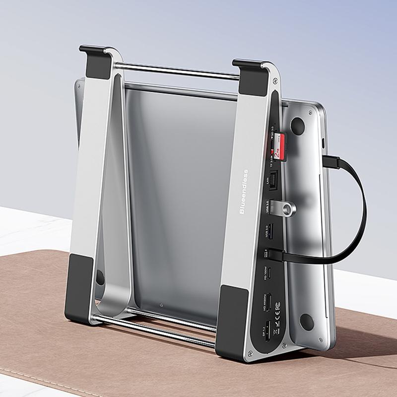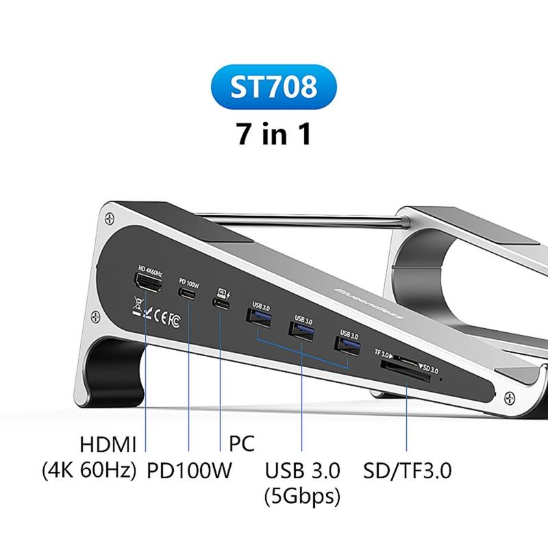 • Support pour ordinateur portable 7 en 1 Blueendless ST708 avec concentrateur USB - HDMI 4K@60Hz, charge PD 100 W, 3 ports USB 3.0, lecteur de carte TF, rehausseur en aluminium pour ordinateur portable