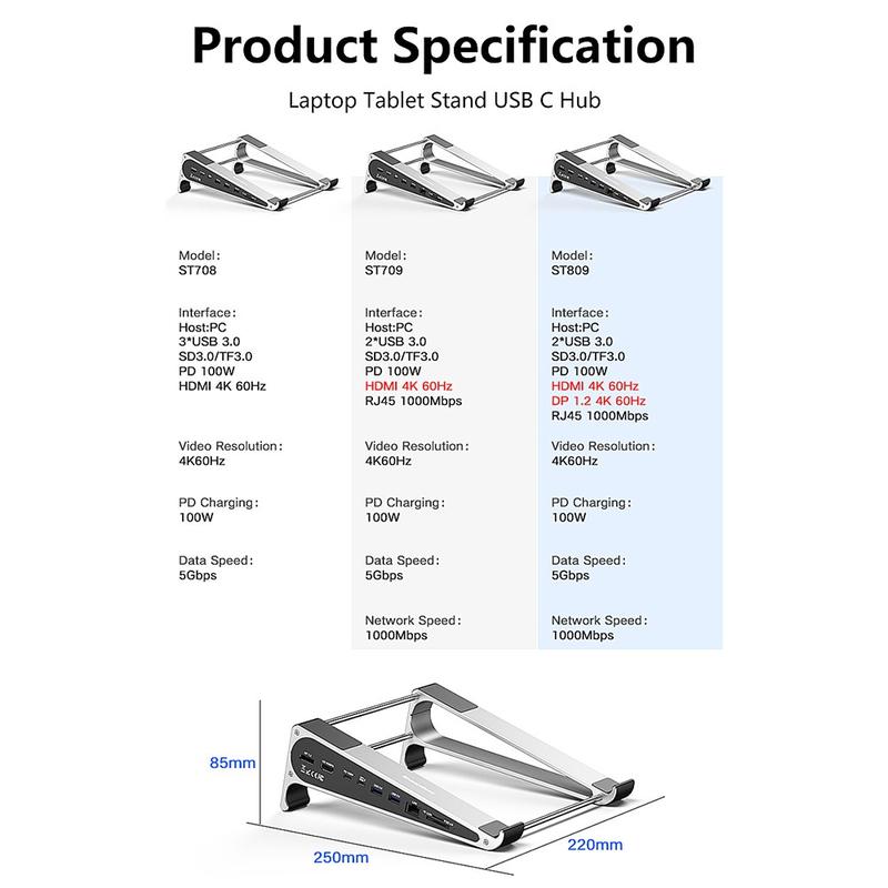 Avec la prise en charge de la sortie vidéo 4K@60Hz et la charge passante Power Delivery de 100W, le ST708 alimente votre ordinateur portable tout en étendant votre affichage à un moniteur externe. La structure en alliage d'aluminium avec des tubes de support en acier inoxydable offre stabilité et durabilité, ce qui le rend adapté aux bureaux à domicile, aux postes de travail créatifs et aux configurations de voyage.