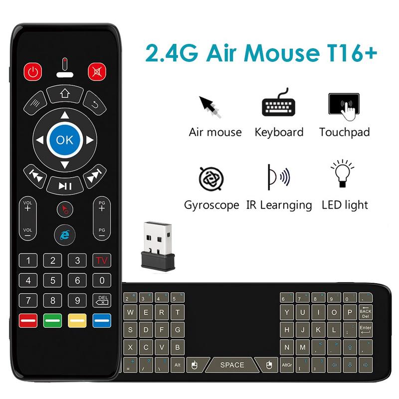 La télécommande sans fil T16+ combine plusieurs méthodes de contrôle dans un seul appareil compact : souris aérienne à gyroscope, pavé tactile, clavier QWERTY complet et apprentissage IR à 5 touches. Elle est conçue pour remplacer plusieurs contrôleurs et simplifier la navigation sur les appareils intelligents.
