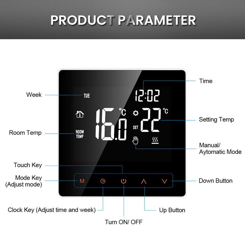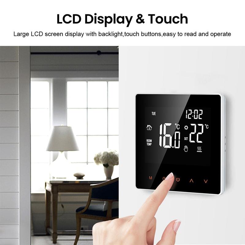 Le grand écran tactile LCD rétroéclairé est facile à lire de jour comme de nuit. Son design élégant en une seule pièce confère au thermostat un look épuré et moderne, tandis que sa surface anti-rayures lui permet de rester présentable au fil du temps. Vous pouvez choisir entre le mode manuel pour un réglage direct et le mode automatique pour un chauffage programmé, en fonction de votre routine quotidienne et de vos préférences personnelles.