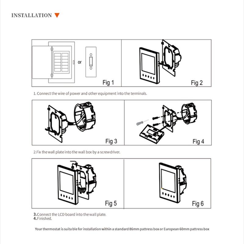 Le BHT-1000GB est conçu pour être installé dans un boîtier encastré standard de 86 x 86 mm ou dans un boîtier mural européen classique, ce qui facilite son intégration dans de nombreuses installations existantes. Sa large compatibilité en matière de tension ajoute également à la flexibilité d'installation, lui permettant de fonctionner dans un large éventail d'environnements où le chauffage au sol électrique est utilisé.