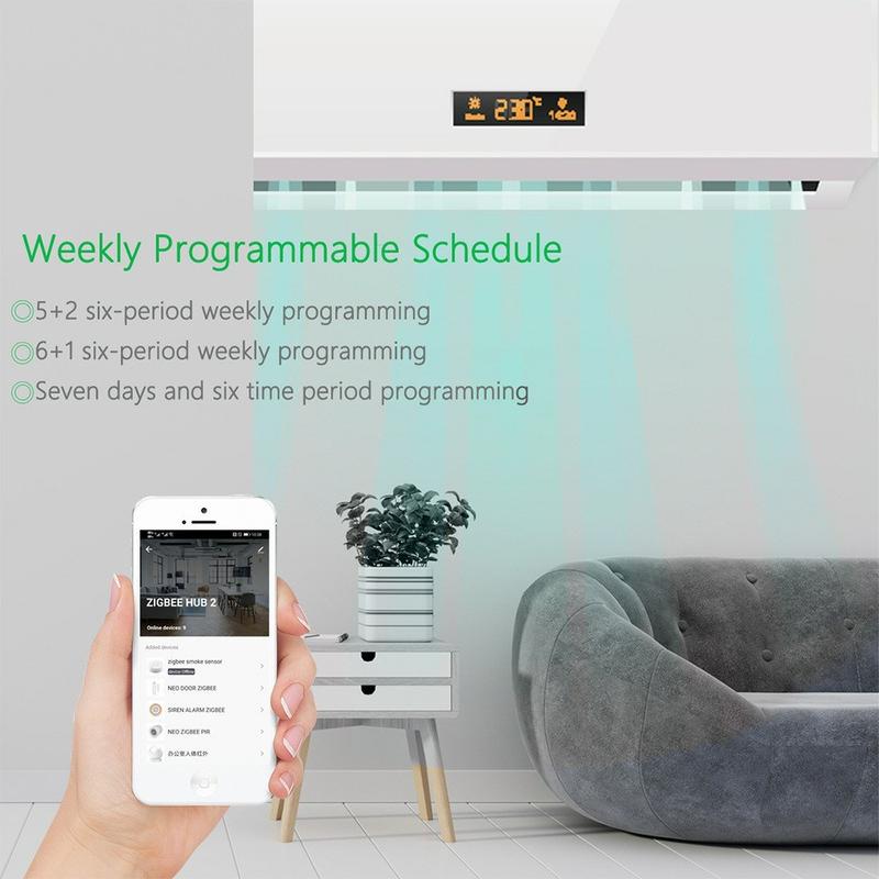 - Programmateur hebdomadaire - Six plages horaires par jour, sept jours sur sept, directement dans l'application Tuya - ne chauffez que lorsque vous en avez besoin.