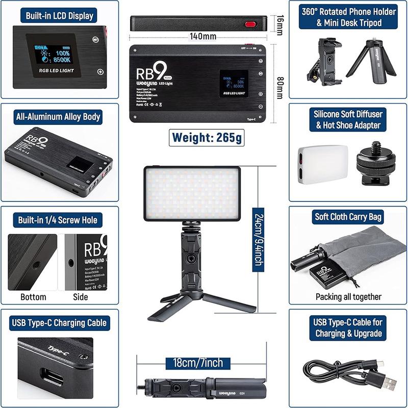 Weeylite RB9 Lumière vidéo RVB portable 2500-8500 K avec contrôle par application