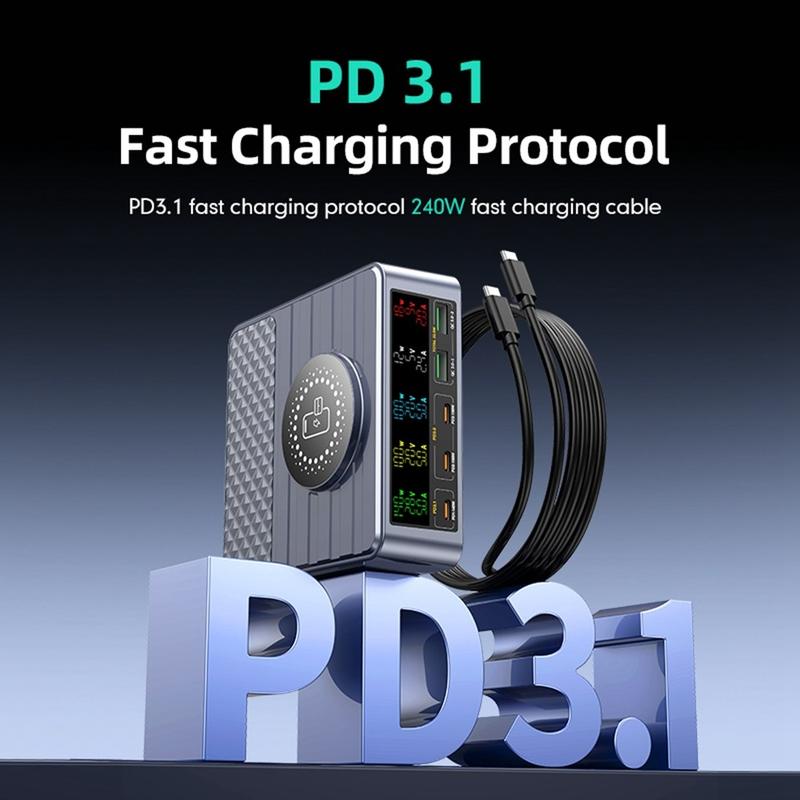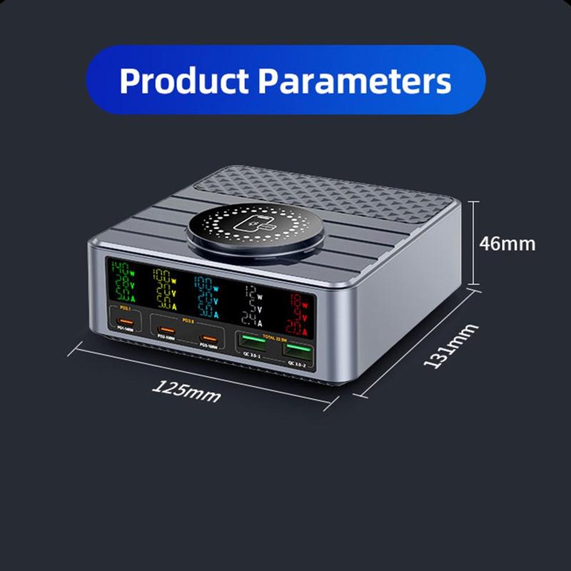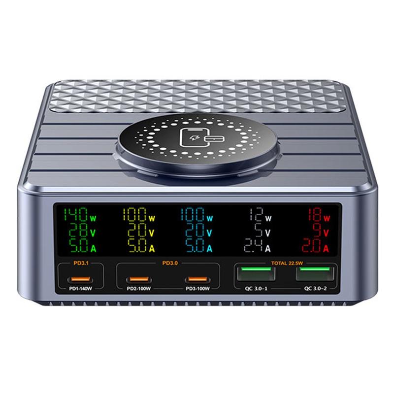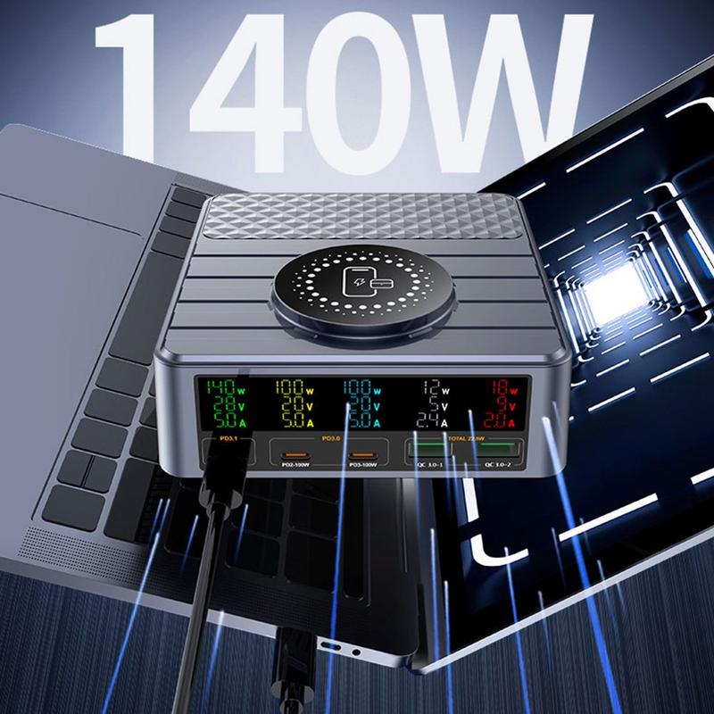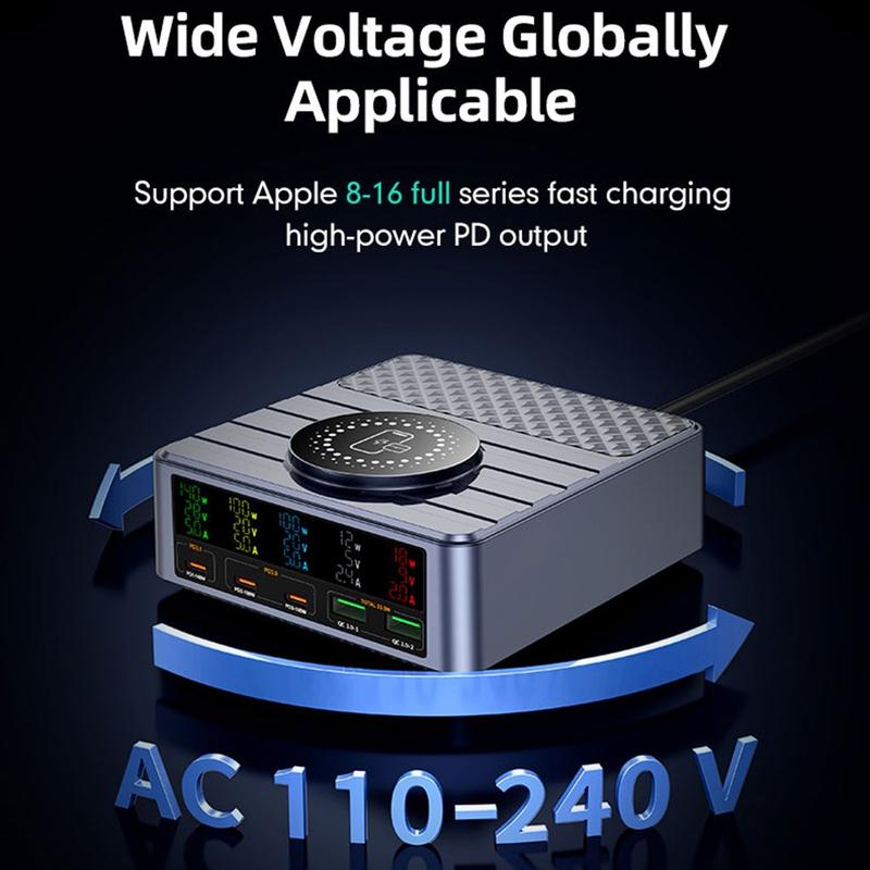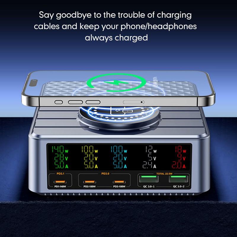 - Six ports de charge : 2× PD, 3× QC, 1× pad de charge sans fil