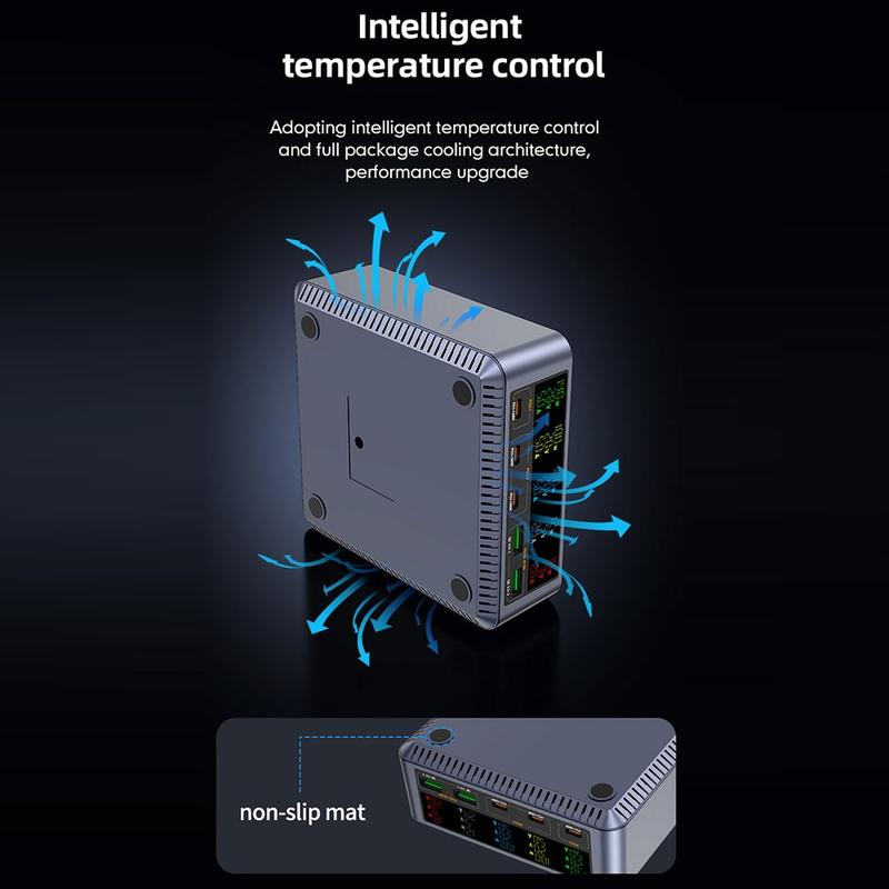 L'affichage numérique intégré permet de connaître en temps réel la puissance de charge et l'état des ports, ce qui facilite le contrôle de la distribution d'énergie. Doté d'une protection de sécurité à 9 niveaux, le chargeur garantit un fonctionnement sûr et stable pour tous les appareils électroniques connectés.
