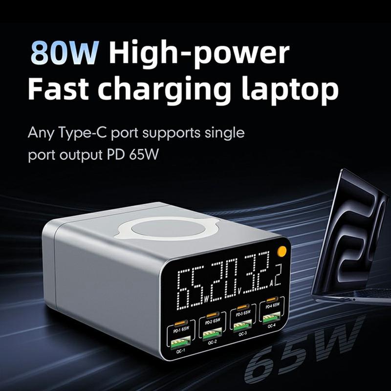 Transformez votre espace de travail en un centre de charge rapide rationalisé avec la station de charge de bureau WLX-M3 80W, qui offre neuf sorties de charge alimentées par la technologie GaN. Que vous chargiez des ordinateurs portables, des téléphones, des écouteurs ou des accessoires, elle fournit une énergie propre, puissante et organisée pour tous vos appareils à la fois.