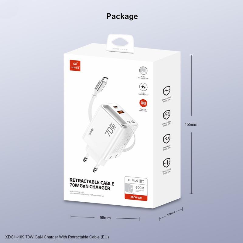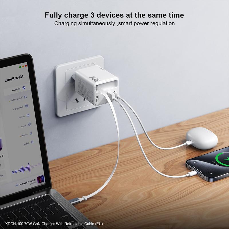 Xundd XDCH-109 Chargeur rapide GaN 70W - Prise EU, câble USB-C rétractable de 60 cm et adaptateur d'alimentation à 3 ports pour ordinateurs portables, tablettes et smartphones.