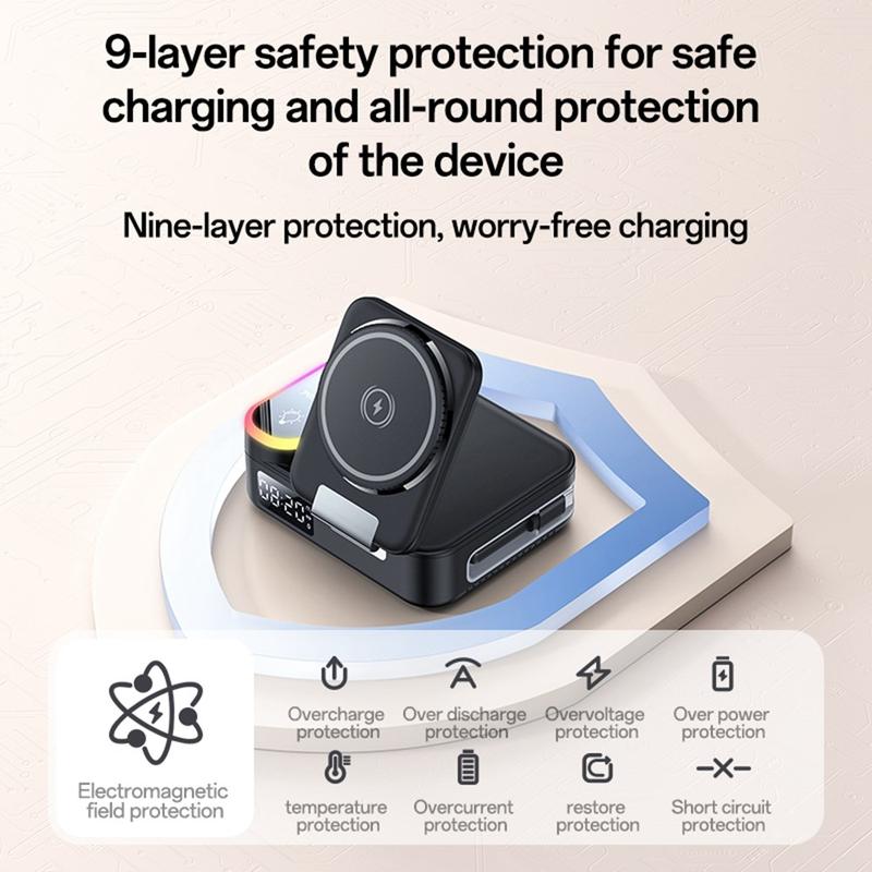 - Conception multifonctionnelle 8-en-1 - Intègre des blocs de charge sans fil, des ports de charge rapide USB-A et USB-C, une horloge numérique à LED et un éclairage d'ambiance RVB pour une expérience de charge complète.