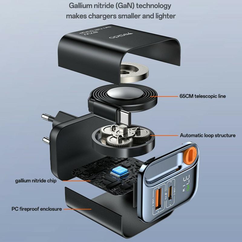 Chargez plus intelligemment et plus rapidement avec le chargeur rapide YESIDO YC100 67W GaN, une solution compacte et efficace conçue pour les appareils modernes. Doté de deux ports, d'une technologie avancée au nitrure de gallium (GaN) et d'un câble rétractable intégré, il allie puissance, commodité et sécurité - parfait pour la maison, le bureau ou les voyages.