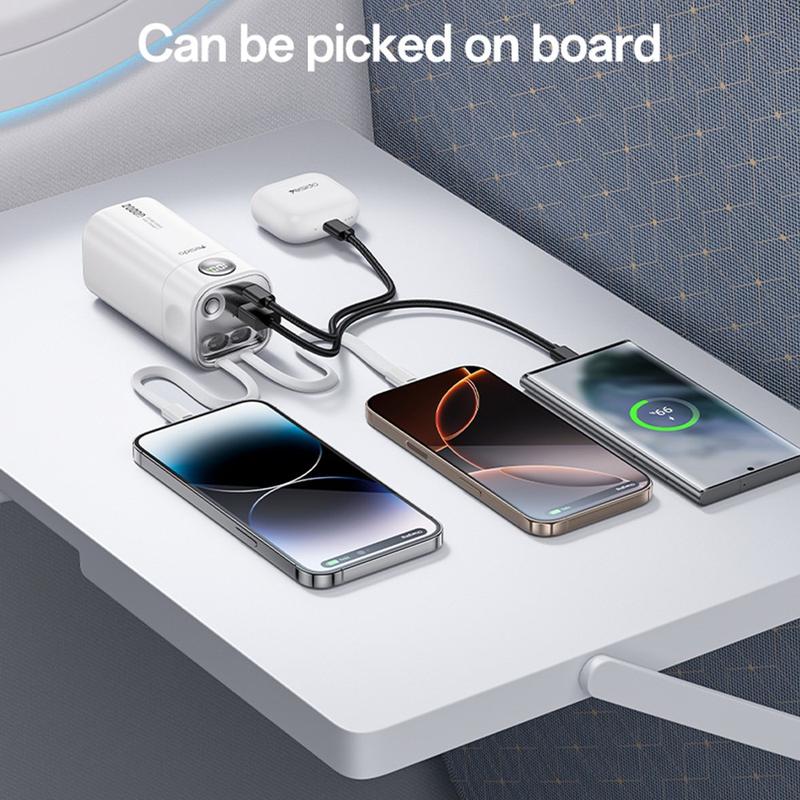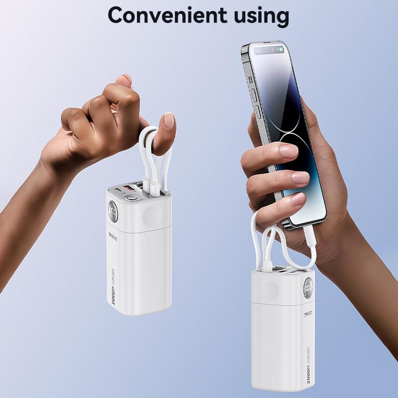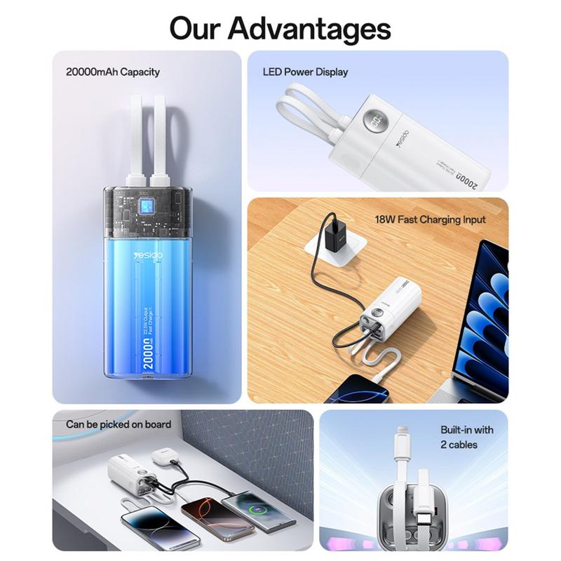 Gardez tous vos appareils à jour lors de vos voyages d'affaires, festivals ou trajets quotidiens. Le YESIDO YP86, très pratique, offre une énorme capacité de 20000mAh, deux câbles intégrés et une puissance de charge rapide de 22.5W dans une coque ABS durable qui ne pèse que 0,36 kg.